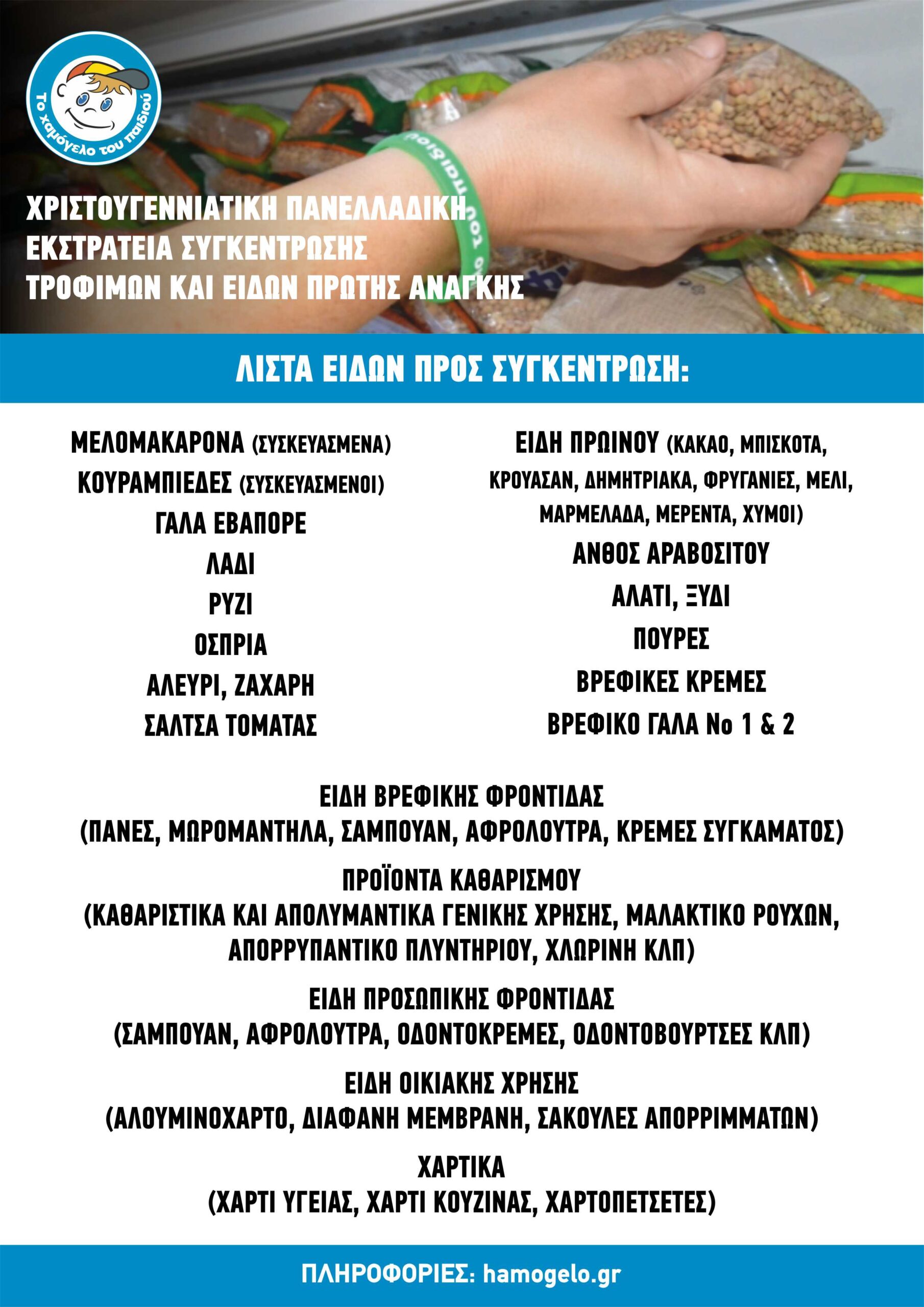 Καλούμε όλους εσάς, ιδιώτες και επιχειρήσεις, να συμμετέχετε στην πανελλαδική εκστρατεία συγκέντρωσης τροφίμων και άλλων βασικών ειδών, και μαζί να εξασφαλίσουμε ένα ζεστό και πλήρες χριστουγεννιάτικο τραπέζι στις δεκάδες χιλιάδες οικογένειες, που σήμερα δοκιμάζονται, αδυνατώντας να καλύψουν έστω τα στοιχειώδη για τα παιδιά τους.