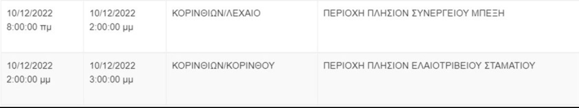 Από το ΔΕΔΔΗΕ Κορίνθου αναφέρεται: “Λόγω εργασιών συντήρησης του Δικτύου του ΔΕΔΔΗΕ θα πραγματοποιηθεί διακοπή ηλεκτροδότησης στις παρακάτω περιοχές: