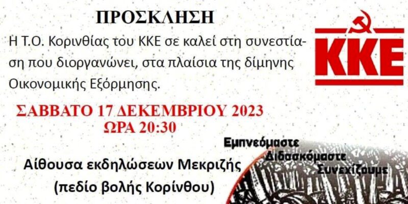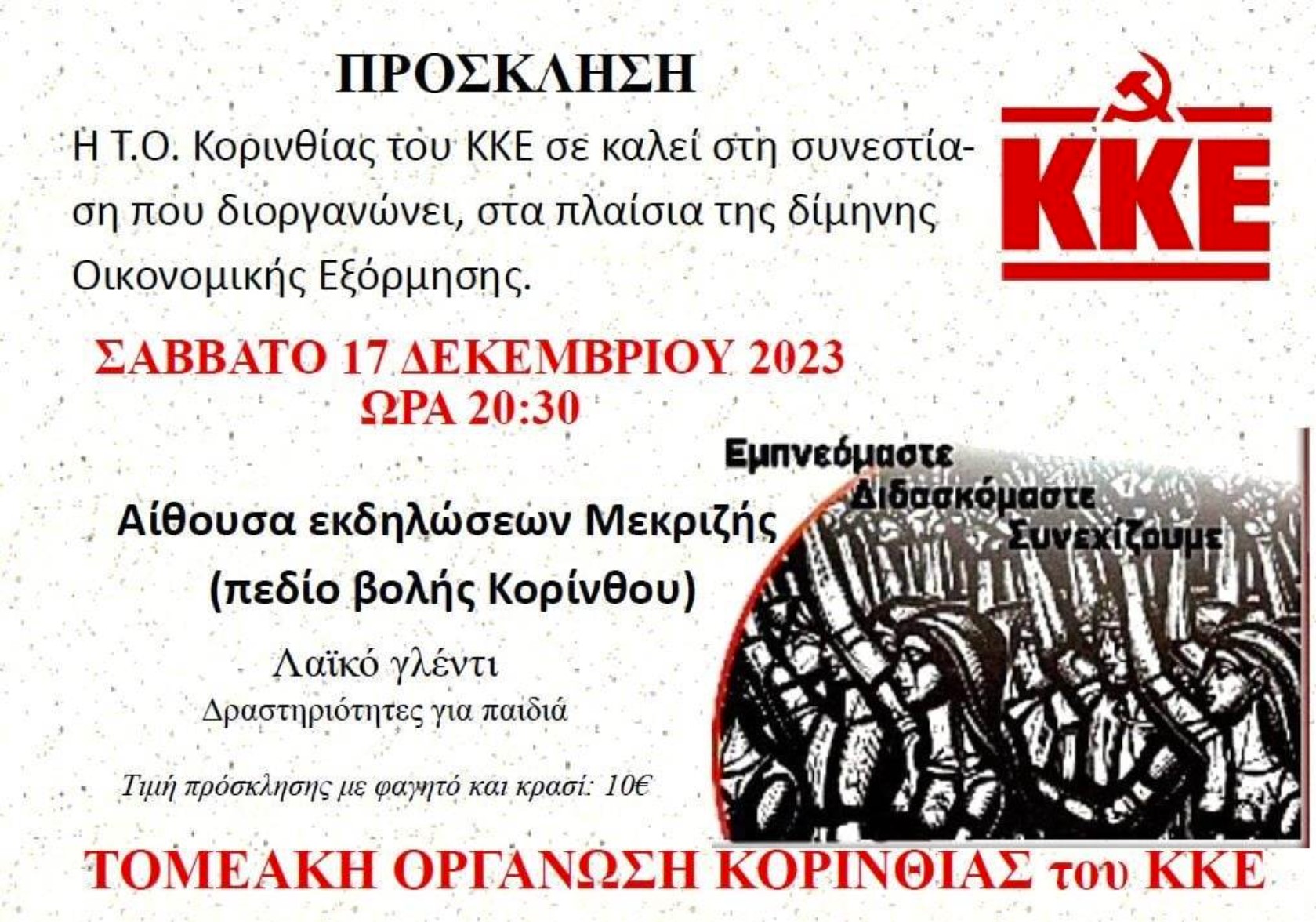 ΕΚΔΗΛΩΣΕΙΣ Λαϊκό γλέντι στην Κόρινθο απο το ΚΚΕ By SFEDONA 14/12/2022 ShareTweet 0 Η Τοπική Οργάνωση Κορινθίας του ΚΚΕ διοργανώνει εκδήλωση-λαϊκό γλέντι το Σάββατο 17 Δεκεμβρίου 2023 στις 20.30 στο κέντρο «Μεκριζής». Τιμή πρόσκλησης με φαγητό και κρασί 10 ευρώ