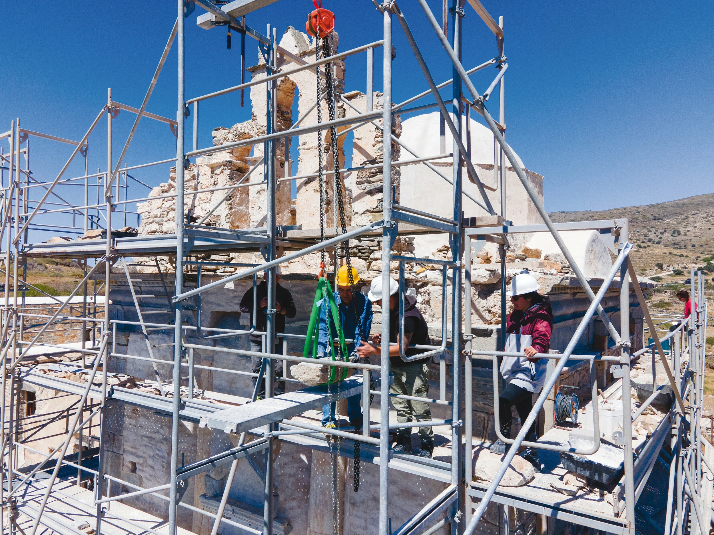 Τον συναντώ, μαζί με την πολυμελή ομάδα του και τα στελέχη της Εφορείας, στις εγκαταστάσεις της στο κέντρο της Αθήνας. Στις αίθουσες αυτές οι συντηρητές καθημερινά γεφυρώνουν εννοιολογικά τον αρχαίο με τον σύγχρονο κόσμο. Από το 2016 όλοι αυτοί οι επιστήμονες, οι τεχνίτες, οι εργάτες, ακόμα και το φυλακτικό και διοικητικό προσωπικό, εργάζονταν πυρετωδώς, υποστηρίζοντας με κάθε μέσο την αναστήλωση ενός αρχαιολογικού οικοδομήματος που ενώνει διαφορετικούς αιώνες και αναδεικνύει την πολύτιμη ιστορία του άνυδρου νησιού των Κυκλάδων.