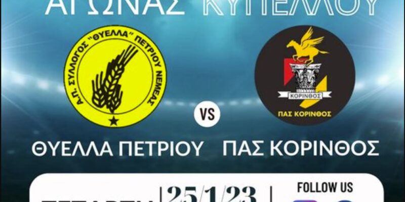 Αγώνας Κυπέλλου ΕΠΣ Κορινθίας. Ο ΠΑΣ Κόρινθος αντιμετωπίζει αύριο την “Θύελλα” Πετρίου, στο Πετρί, για την Γ’ Φάση του Κυπέλλου. Η παρουσία όλων θα εμψυχώσει την ομάδα. Ο αγώνας ξεκινάει στις 14:30.
