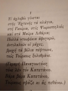 Μη δυνηθέντες (οι Έλληνες) και αυτούς τους εναπομείναντες 600 Τούρκους να τους αιχμαλωτίσουν ένεκα των διχονοιών, διότι είχον και τον νουν τους ποιος να πρωταρπάξη τα εισοδήματα των σταφίδων της Βοστίτζης και ούτω πως άφησαν τους ολίγους Τούρκους να φύγουν»
