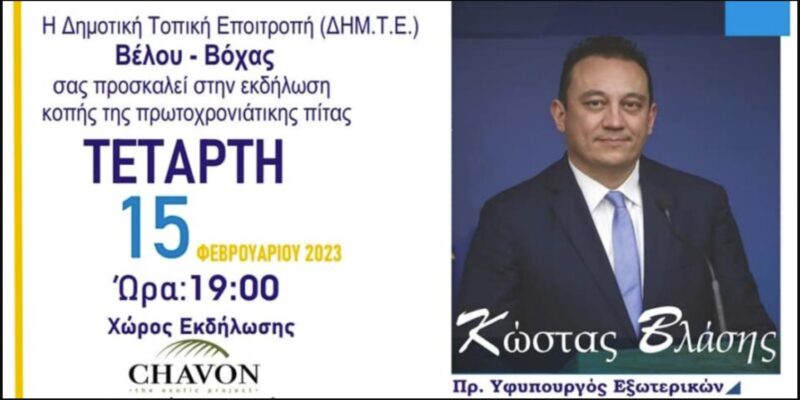 Η Δημοτική Τοπική Επιτροπή Βέλου – Βόχας (ΔΗΜ.Τ.Ε.) Νέας Δημοκρατίας σας προσκαλεί στην κοπή της Πρωτοχρονιάτικης βασιλόπιτας που θα πραγματοποιηθεί την Τετάρτη 15 Φεβρουαρίου 2023 και ώρα 19.00 στο Βραχάτι , Cafe CHAVON ( Λαζανά 101, παραλία Βραχατίου).