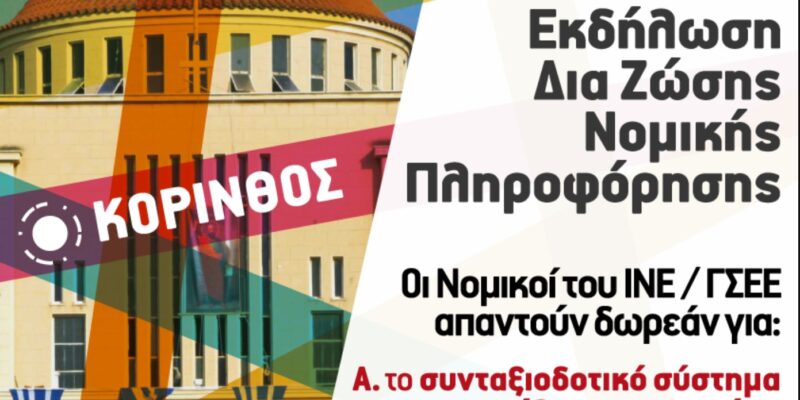Η εκδήλωση, δια ζώσης πληροφόρησης με την παροχή δωρεάν υπηρεσιών νομικής πληροφόρησης ,θα πραγματοποιηθεί στο Εργατικό Κέντρο Κορίνθου την και ώρες Τετάρτη 1 Μαρτίου 2023 11:00 έως 18:00 .