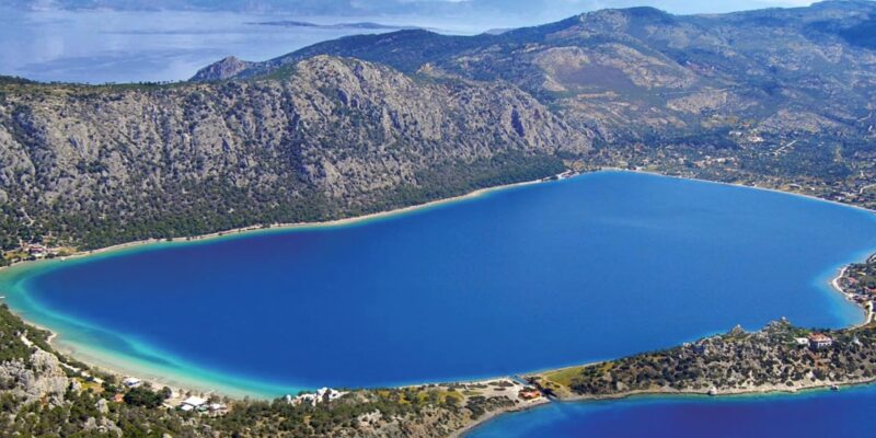 Επικοινωνεί με τα νερά του Κορινθιακού κόλπου από ένα πολύ στενό κανάλι που το πλάτος του δεν υπερβαίνει τα 6 μέτρα.