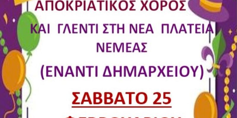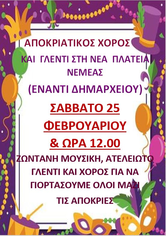Αποκριάτικο ξεφάντωμα το Σάββατο 25 Φεβρουαρίου στη Νέα Πλατεία Νεμέας (έναντι Δημαρχείου) και ώρα 12.00 με ζωντανή μουσική, κωμικούς να διασκεδάζουν τους μικρούς φίλους με πλήθος δραστηριοτήτων και προσωπογραφίες.