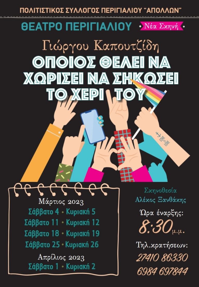 ΟΛΑ ΤΑ ΣΑΒΒΑΤΟΚΥΡΙΑΚΑ ΤΟΥ ΜΑΡΤΙΟΥ ΚΑΙ 1-2 ΑΠΡΙΛΙΟΥ, ΏΡΑ 8:30 μμ. στο θέατρο Περιγιαλίου.