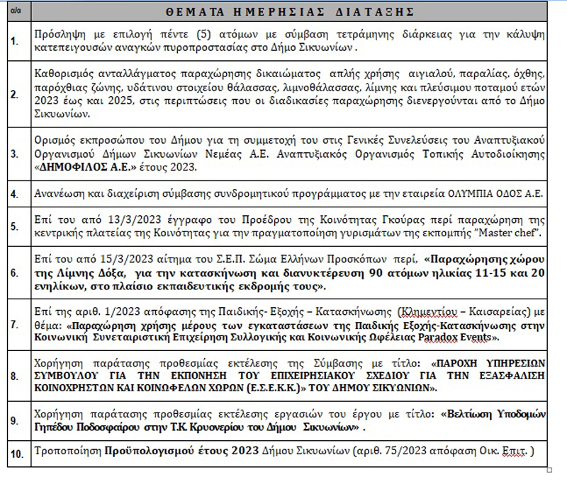 Στην ΕΚΤΑΚΤΗ δια ζώσης συνεδρίαση του Δημοτικού Συμβουλίου του Δήμου Σικυωνίων που θα διεξαχθεί σήμερα Παρασκευή 7/4 στην αίθουσα του Δ. Σ. του Δημοτικού στις 19:00μ.μ θα γίνει στο 5ο θέμα συζήτηση επί του εγγράφου του προέδρου της κοινότητας Γκούρας περί παραχώρηση της κεντρικής πλατείας της κοινότητας για την πραγματοποίηση γυρισμάτων της εκπομπής ”Master chef”.