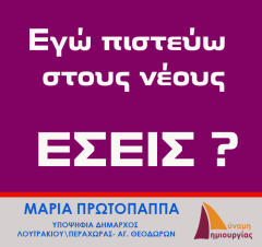 Όπως βλέπετε μέχρι τώρα όχι μόνο έχω τολμήσει την ανανέωση αλλά εμπιστεύομαι απόλυτα, νέους ανθρώπους, που είμαι σίγουρη ότι με τις επιστημονικές γνώσεις τους, το μεράκι και τον ενθουσιασμό τους θα πάνε τον δήμο Λουτρακίου-Περαχώρας-Αγίων Θεοδώρων και πάλι στην κορυφή!