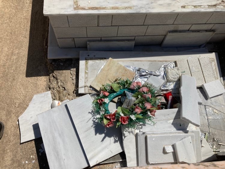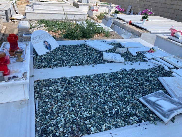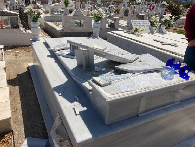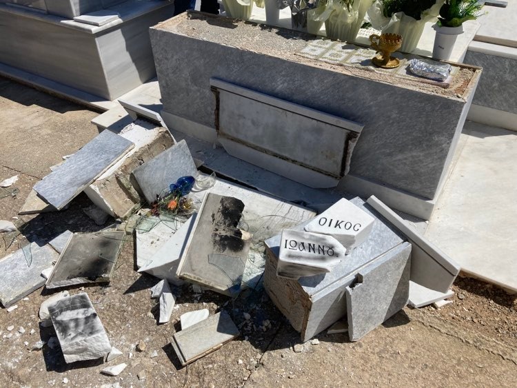 Σπασμένα μάρμαρα, ξηλωμένοι σταυροί, γυαλιά, όλα είχαν γίνει ένα κουβάρι απο ομάδα 12 ατόμων εισήλθε στο νεκροταφείο, σύμφωνα με πληροφορίες, και με βαριοπούλες τα έσπασαν όλα
