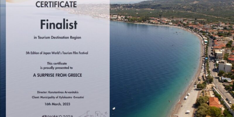 Μία σημαντική διάκριση για τον Δήμο Ξυλοκάστρου – Ευρωστόνης στον χώρο του πολιτισμού . Η ταινία «A surprise from Greece» που δημιουργήθηκε στο πλαίσιο των ενεργειών τουριστικής προβολής και προώθησης του Δήμου, ολοκλήρωσε το ταξίδι της στην Ιαπωνία, λαμβάνοντας πιστοποιητικό συμμετοχής ως μια από τις 32 finalist του διαγωνισμού. Η ταινία ξεχώρισε ανάμεσα σε 1.284 ταινίες! , όπως μας ενημερώνει ο δήμος.