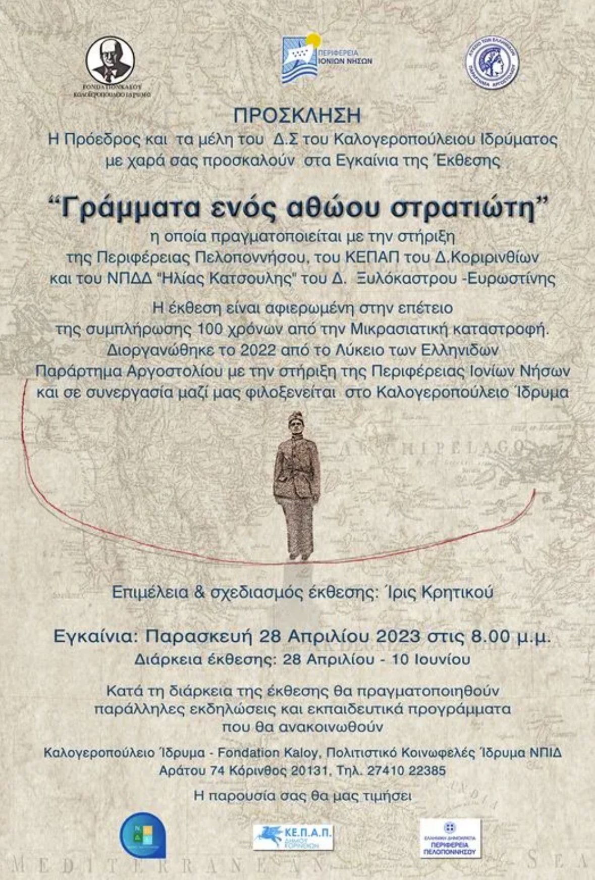 ΕΚΔΗΛΩΣΕΙΣ ΚΑΛΟΓΕΡΟΠΟΥΛΕΙΟ ΙΔΡΥΜΑ : “ΓΡΑΜΜΑΤΑ ΕΝΟΣ ΑΘΩΟΥ ΣΤΡΑΤΙΩΤΗ” By SFEDONA 25/04/2023 ShareTweet 0 ΠΡΟΣΚΛΗΣΗ ΓΙΑ ΤΗΝ ΕΚΘΕΣΗ “ΓΡΑΜΜΑΤΑ ΕΝΟΣ ΑΘΩΟΥ ΣΤΡΑΤΙΩΤΗ” ΕΓΚΑΙΝΙΑ ΠΑΡΑΣΚΕΥΗ 28 ΑΠΡΙΛΙΟΥ ΣΤΙΣ 8.00 μμ
