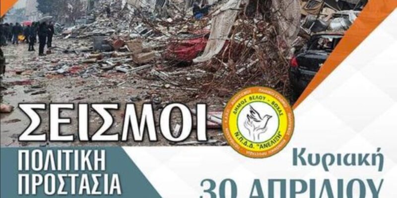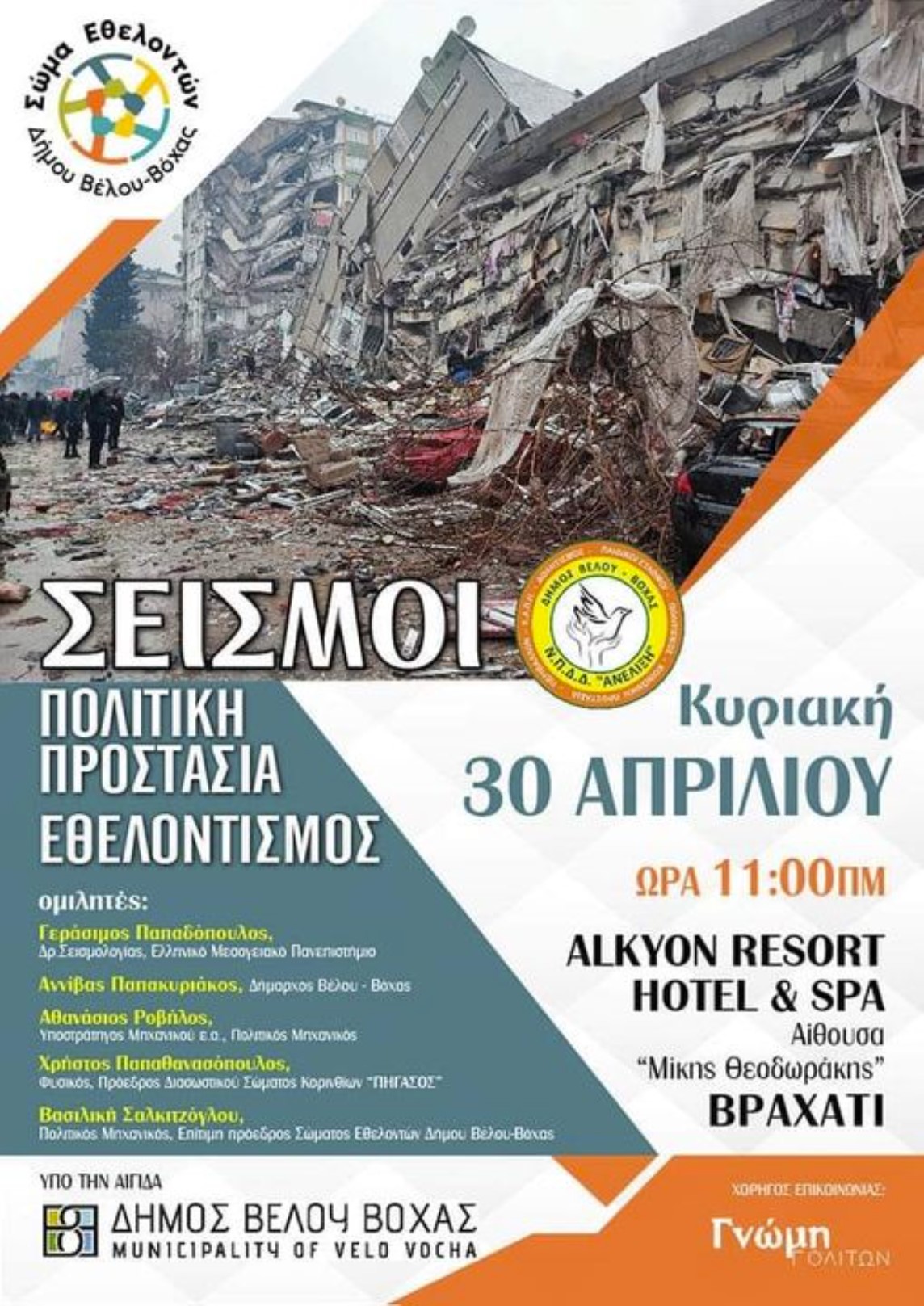 Σας περιμένουμε στην Ενημερωτική – επιστημονική εκδήλωση με θέμα «Σεισμός, επιπτώσεις,πολιτική προστασία, εθελοντισμός προφύλαξη» που θα πραγματοποιηθεί στο Alkyon Resort Hotel, την Κυριακή 30 Απριλίου και ώρα 11 π.μ.