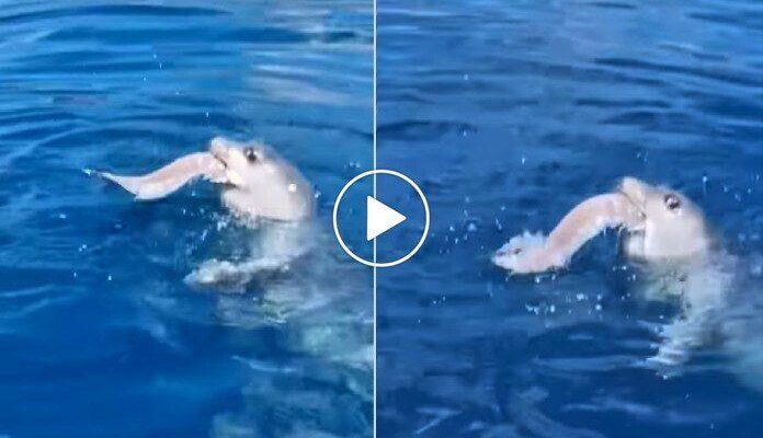 Το θηλαστικό των φωκίδων αφού έχει φτάσει κοντά στη βάρκα των αλιέων, αρπάζει ένα μεγάλο ψάρι και το «χλαπακιάζει» μπροστά τους. Εκείνοι δεν χάνουν την ευκαιρία να καταγράψουν σε βίντεο το συμβάν που κάθε άλλο παρά συχνό είναι.