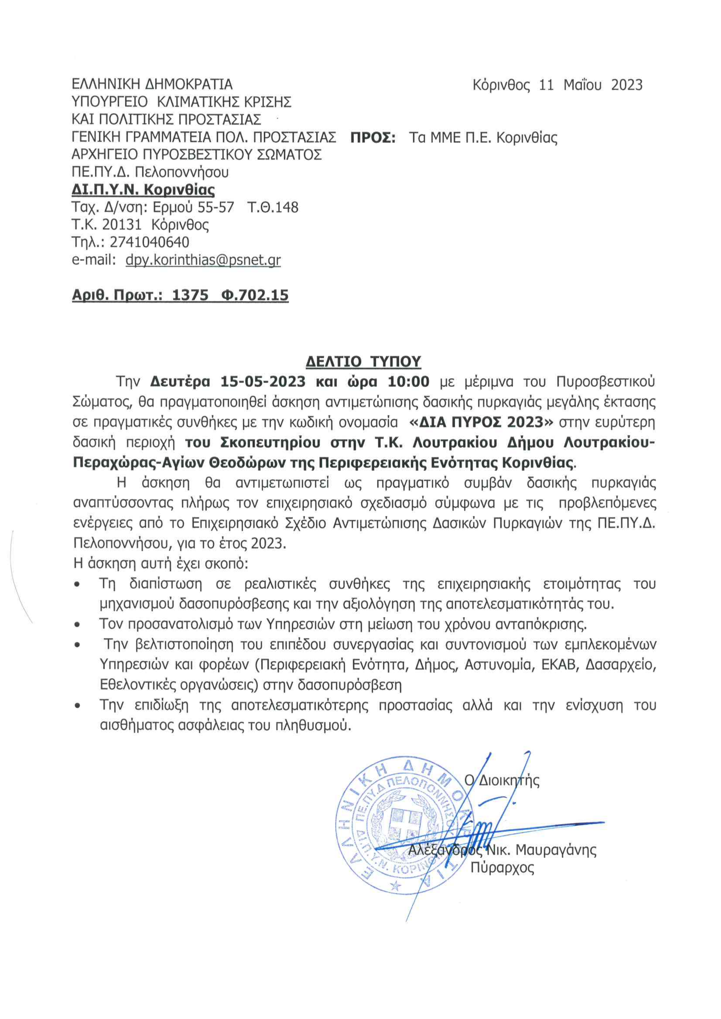 1_ΚΟΡΙΝΘΙΑ Σήμερα Η Πυροσβεστική θα πραγματοποιήσει άσκηση μεγάλης έκτασης στο Λουτράκι By SFEDONA 15/05/2023 ShareTweet 0