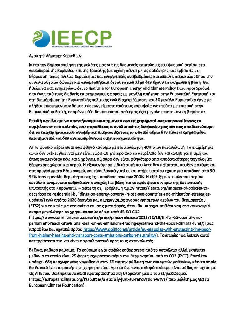 Απάντηση στον Δήμαρχο Κορινθίων Βασίλη Νανόπουλο σχετικά με τους ισχυρισμούς για το φυσικό αέριο και στο ότι εμείς στον φορέα IEECP δεν έχουμε επιστημονική βάση.