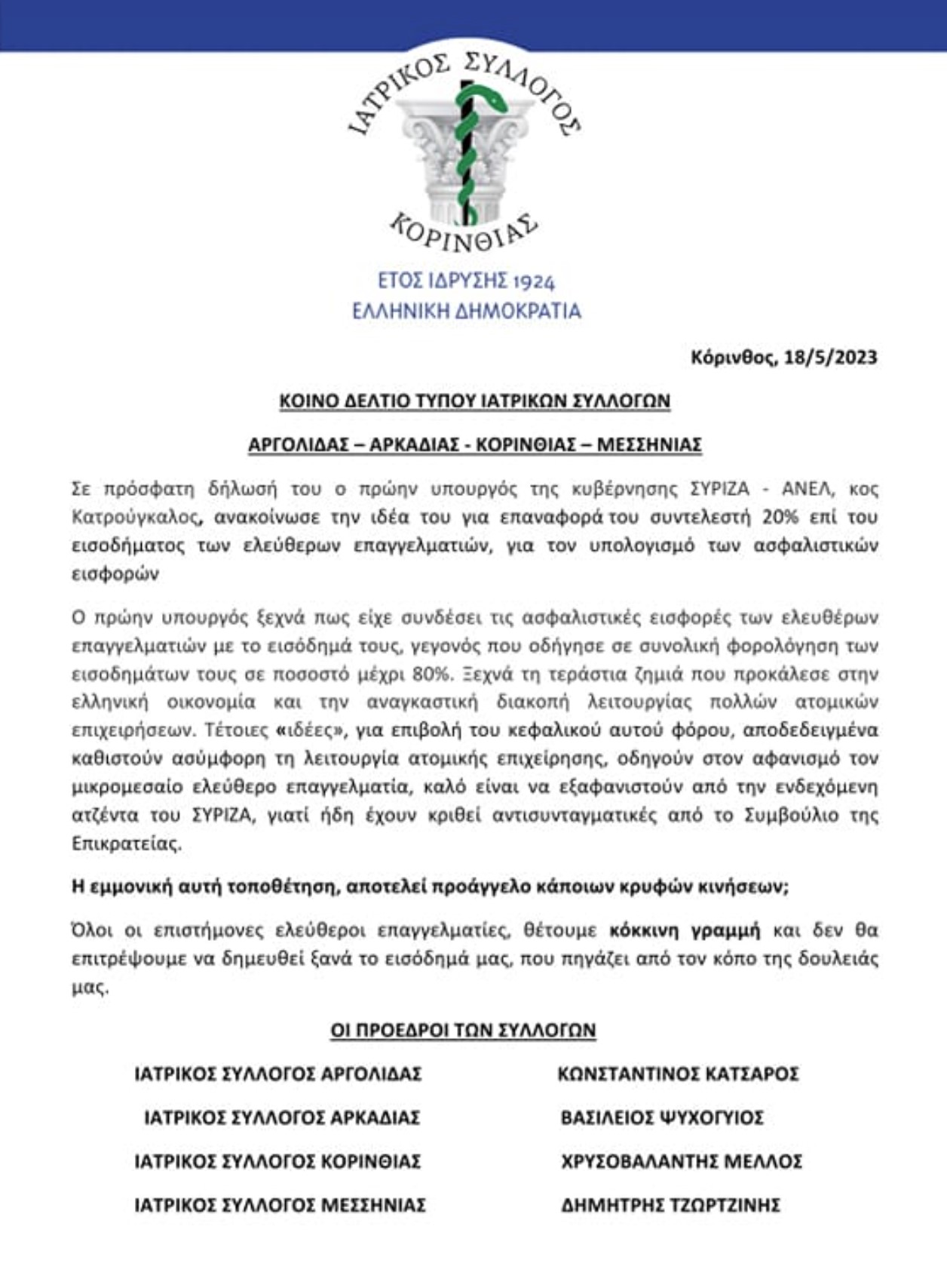 Ο Ιατρικού Συλλόγου Κορινθίας σε ένα κοινό δελτίο Τύπου των Ιατρικών Συλλόγων της Περιφέρειάς  μας , δηλαδή της Αργολίδας, της Αρκαδίας και της Μεσσηνίας απαντά στις δηλώσεις Κατρούγκαλου για την επαναφορά Του συντελεστή 20% επί του εισοδήματος για τον υπολογισμό της ασφαλιστικής εισφοράς  για τους ελεύθερους επαγγελματίες.