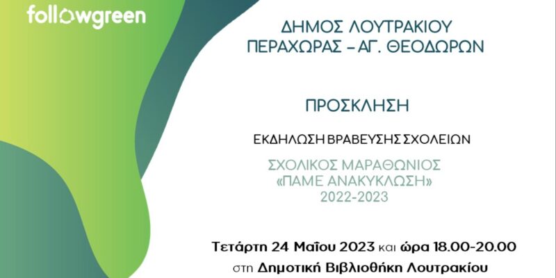 Η εκδήλωση βράβευσης των σχολείων λαμβάνει χώρα στο πλαίσιο του 5ου Σχολικού Μαραθωνίου Ανακύκλωσης «Πάμε ανακύκλωση 2022 -2023», της δημοτικής πλατφόρμας ανακύκλωσης Followgreen του Δήμου Λουτρακίου – Περαχώρας – Αγ. Θεοδώρων.