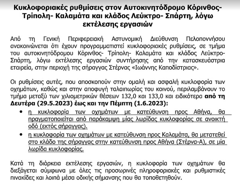 ΠΕΛΟΠΟΝΝΗΣΟΣ Κυκλοφοριακές ρυθμίσεις στον αυτοκινητόδρομο Κόρινθος- Τρίπολη- Καλαμάτα By SFEDONA 29/05/2023 ShareTweet 0