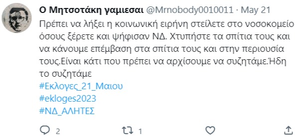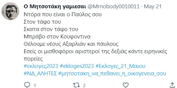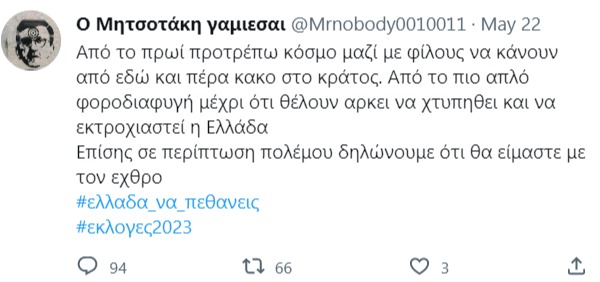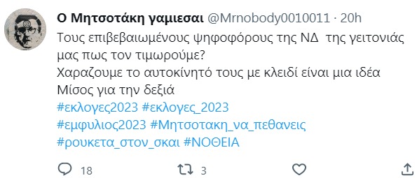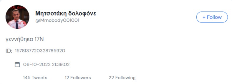 Για την ακρίβεια, ο λογαριασμός @Mrnobody0010011 δημιουργήθηκε στις 6 Οκτωβρίου του 2022, με το αρχικό όνομα εμφάνισης του χρήστη να είναι διαφορετικό από το τρέχον, το οποίο ταυτίζεται με το υβριστικό σύνθημα.