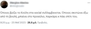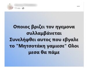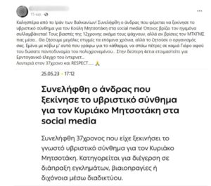 Αξίζει επίσης να σημειωθεί πως, σύμφωνα με το ρεπορτάζ, ο συλληφθείς “παραδέχτηκε ότι ήταν αυτός που είχε κάνει τις αναρτήσεις”, ενώ υποστήριξε “πως δεν είχε κάποιο λόγο που τα έγραφε” και τελικά αφέθηκε ελεύθερος καθώς πρόκειται για πλημμέλημα.