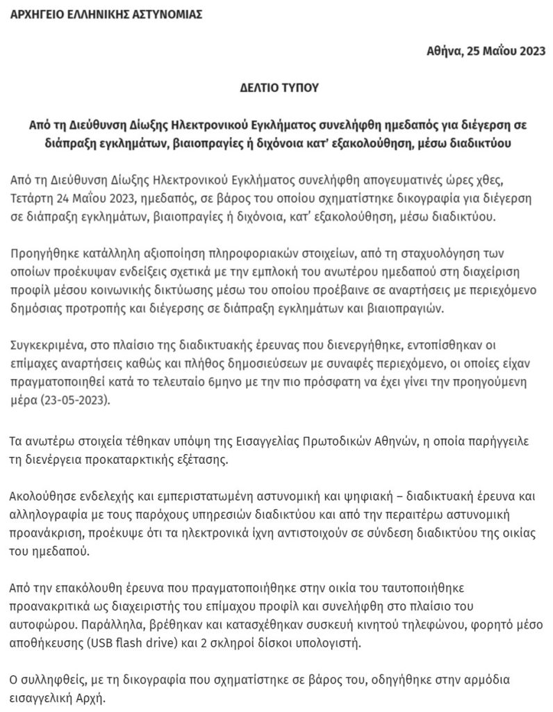 Στον 37χρονο συλληφθέντα ανήκε ο λογαριασμός @Mrnobody0010011 στο Twitter, η λειτουργία του οποίου έχει ανασταλεί. Σύμφωνα με την ανακοίνωση της ΕΛ.ΑΣ., διενεργήθηκε ηλεκτρονική έρευνα σε βάθος έξι μηνών.