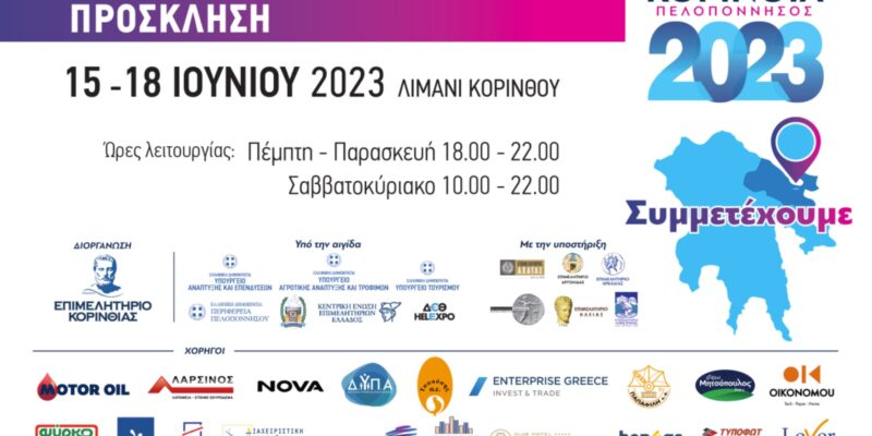 Σε μία έκταση 4500 τ.μ. και με -περίπου- 150 εκθέτες σηκώνει την αυλαία την Πέμπτη η Έκθεση Πελοπόννησος 2023. Πρόκειται για την μεγαλύτερη έκθεση των τελευταίων ετών, που θα φιλοξενήσει η Κόρινθος στο λιμάνι της από την Πέμπτη 15 μέχρι και την Κυριακή 18 Ιουνίου. Οι εκδηλώσεις εκκινούν με τα εγκαίνια της έκθεσης παρουσία των Γιάννη Σταϊκούρα (από τη ΝΔ), Ευκλείδη Τσακαλώτου (από τον ΣΥΡΙΖΑ) και Κώστα Σκανδαλίδη (από το ΠΑΣΟΚ).