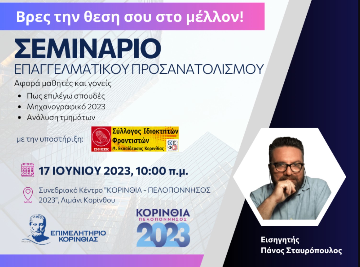Το σεμινάριο απευθύνεται σε μαθητές και γονείς Γυμνασίου και Λυκείου. Έχει στόχο να προετοιμάσει όσους το παρακολουθούν για ένα μέλλον που θα είναι πολύ διαφορετικό από το παρόν. Επαγγέλματα που χάνονται, επαγγέλματα που γεννιούνται, διεπιστημονικότητα, αποσύνδεση λήψης πτυχίου από την επαγγελματική αποκατάσταση, πλήρης αυτοματισμός, κυριαρχία της τεχνητής νοημοσύνης είναι κάποια από τα χαρακτηριστικά του μέλλοντος στο οποίο θα κληθούν τα παιδιά μας να λειτουργήσουν επαγγελματικά.