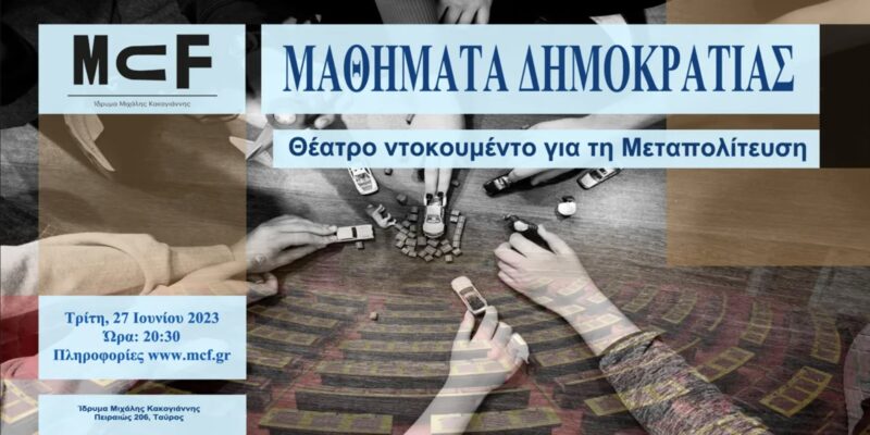 Την Τρίτη, 27 Ιουνίου 2023, ώρα 20:30 το «Βλέμμα εφήβων» θα παρουσιάσει τη φετινή του δουλειά πάνω στη Μεταπολίτευση «Μαθήματα δημοκρατίας». Μπορείτε να προμηθευτείτε τα εισιτήριά σας εδώ https://www.ticketservices.gr/event/mathimata-dimokratias-mcf/?lang=el