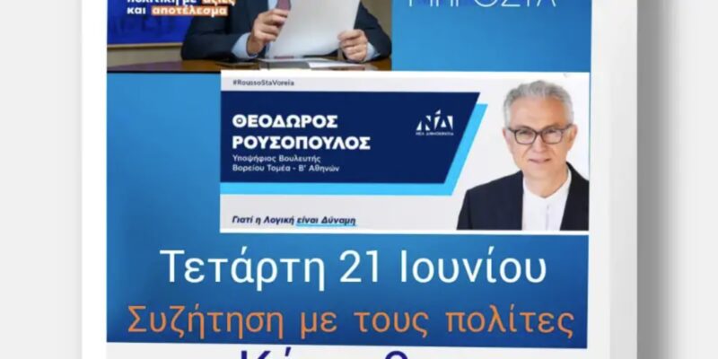 Ο Κωστής Χατζηδάκης, ο Θεόδωρος Ρουσόπουλος και οι υποψήφιοι βουλευτές Κορινθίας Χρίστος Δήμας, Νίκος Ταγαράς, Μαριλένα Σούκουλη-Βιλιάλη, Κόλλιας Κωνσταντίνος, Γιώργος Φερετζάνης και Μαρία Παπακωνσταντίνου θα μιλήσουν την Τετάρτη 21 Ιουνίου , ώρα 20:00 με τους πολίτες έξω από το περίπτερο του κόμματος, πεζόδρομο Εθνικής Αντίστασης.