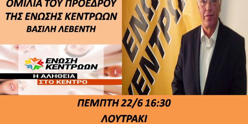 Την Πέμπτη 22 Ιουνίου και ώρα 16:30 θα μιλήσει ο Πρόεδρος της Ένωσης Κεντρώων κ. Βασίλης Λεβέντης σε ανοιχτή προεκλογική συγκέντρωση στην εκλογική περιφέρεια του νομού Κορινθίας και συγκεκριμένα στο Λουτράκι στο καφέ “Ρούλα” επί της οδού Ποσειδώνος 55 στο λιμάνι.