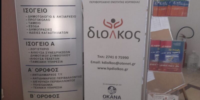 Στα πλαίσια της συνεργασίας και δικτύωσης με τους Δήμους της Περιφερειακής Ενότητας Κορινθίας, καθώς και της αλληλεπίδρασης με την ευρύτερη κοινότητα του τόπου μας, το Κέντρο Πρόληψης των Εξαρτήσεων του νομού μας “Δίολκος,” μετέφερε και τοποθέτησε ενημερωτικά σταντς του Κέντρου σε όλους τους Δήμους του Νομού, «πρωτοστατούντος του Γραμματέα του Διοικητικού Συμβουλίου του Δίολκου, κ. Νικολάου Δημητρίου και της Ομάδας εργαζομένων ( Δήμητρα Παπαναστασίου, Αθηνά Γαϊτάνη, Νατάσα Μητσάκου, Άννα Παπακυριακοπούλου)», όπως αναφέρει.