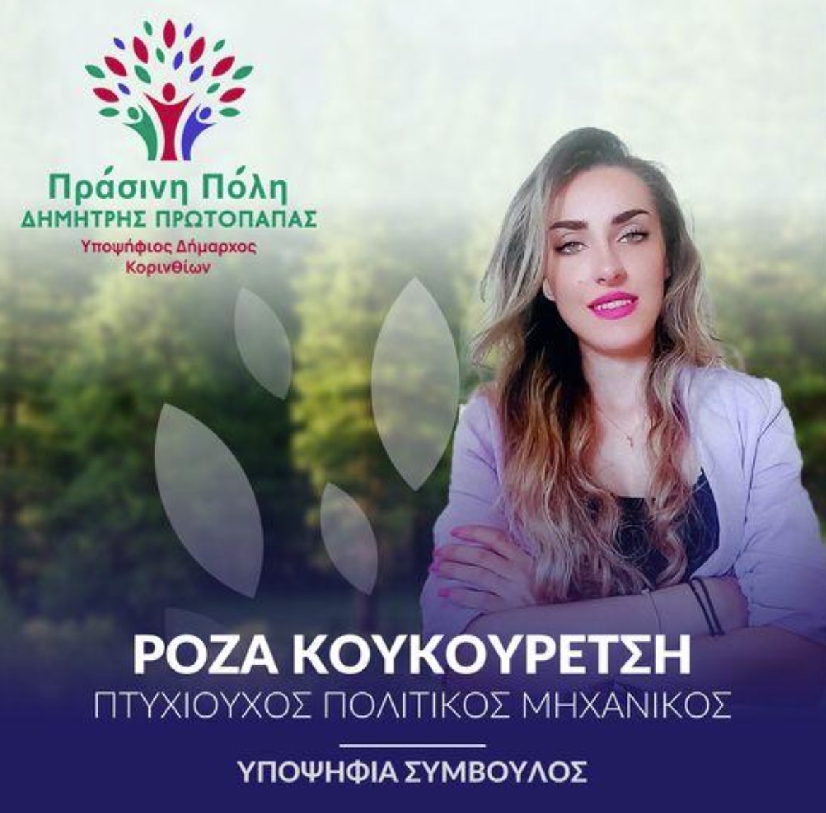 Συμμετέχει για πρώτη φορά στις Δημοτικές εκλογές, ως υποψήφια με την Πράσινη Πόλη. Πιστεύει ότι όλοι μπορούμε να συνεισφέρουμε σε ένα «πράσινο» μέλλον, με στόχο τη βελτίωση της ποιότητας ζωής στο Δήμο Κορινθίων.