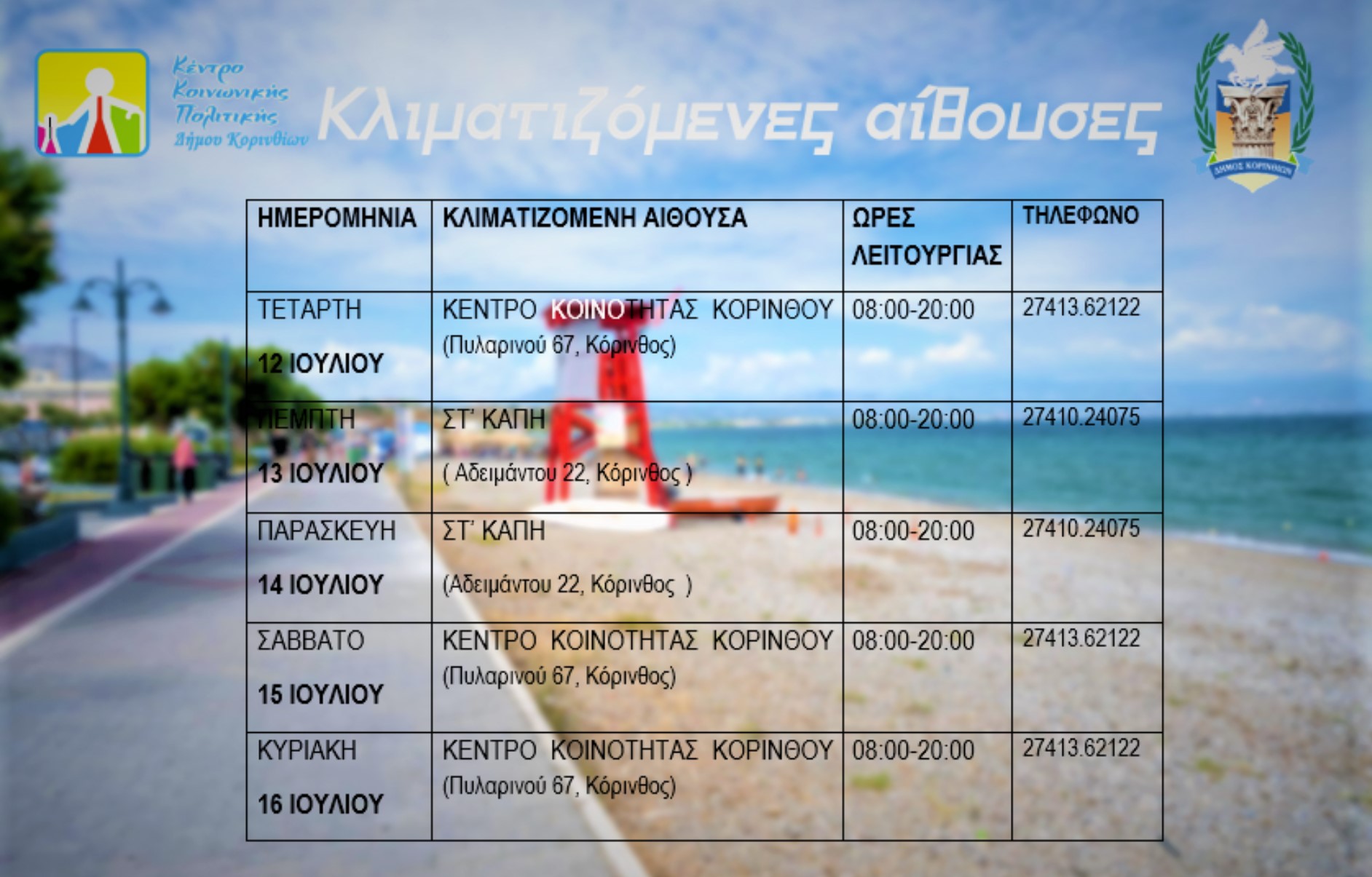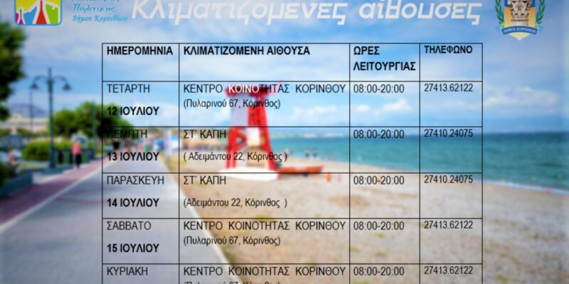 Το Τμήμα Κοινωνικής Προστασίας και το Κέντρο Κοινωνικής Πολιτικής, του Δήμου Κορινθίων, συμπράττουν και διαθέτουν κλιματιζόμενες αίθουσες, για την προστασία των ευάλωτων κοινωνικών ομάδων του δήμου μας, από τις υψηλές θερμοκρασίες που αναμένονται τις επόμενες ημέρες σύμφωνα με την εθνική μετεωρολογική υπηρεσία.