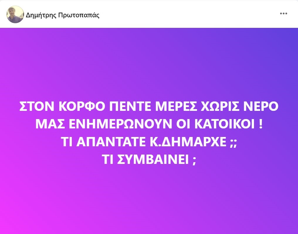 Με ένα post του στον προσωπικό του λογαριασμό στο facebook ο Δημήτρης Πρωτοπαπάς καλεί τον δήμαρχο Κορινθίων Βασίλη Νανόπουλο να δώσει απαντήσεις στο θέμα του νερού στον Κόρφο.