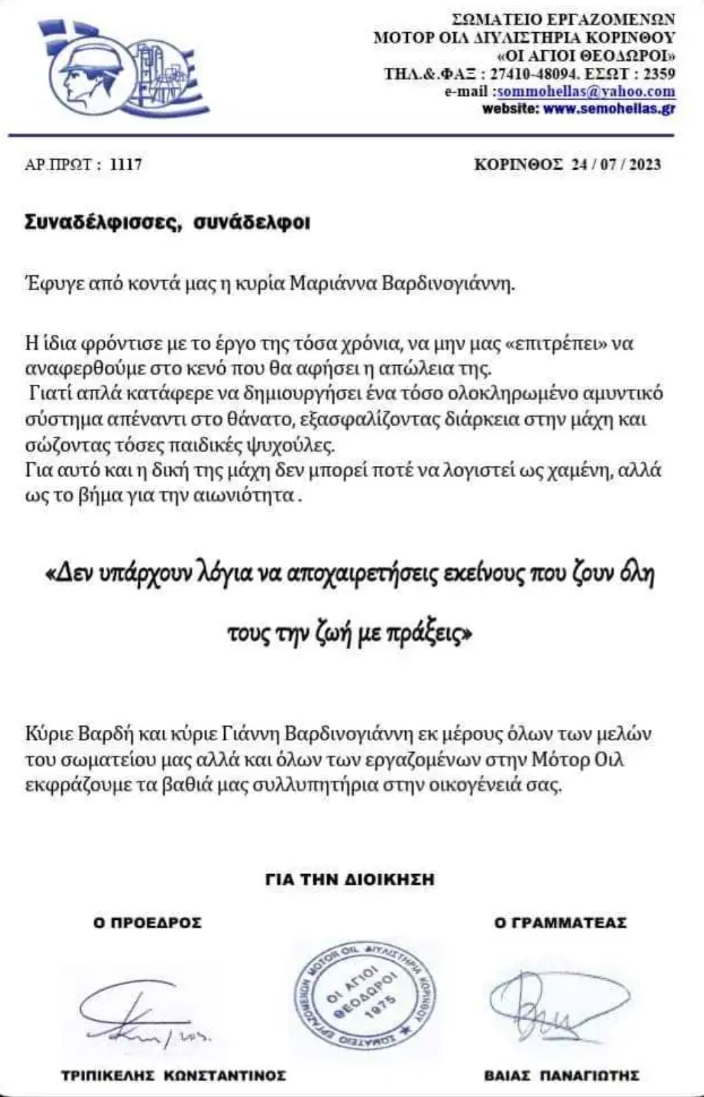 Ανακοίνωση εξέδωσε το Σωματείο των εργαζομένων στην Μότορ Όιλ για τον θάνατο της Μαριάννας Βαρδινογιάννη. Στην ανακοίνωση οι εργαζόμενοι μνημονεύουν το έργο της με το ίδρυμα Ελπίδα, σημειώνοντας χαρακτηριστικά πως “δεν υπάρχουν λόγια να αποχαιρετήσεις αυτούς που ζουν όλη του τη ζωή με πράξεις…”.