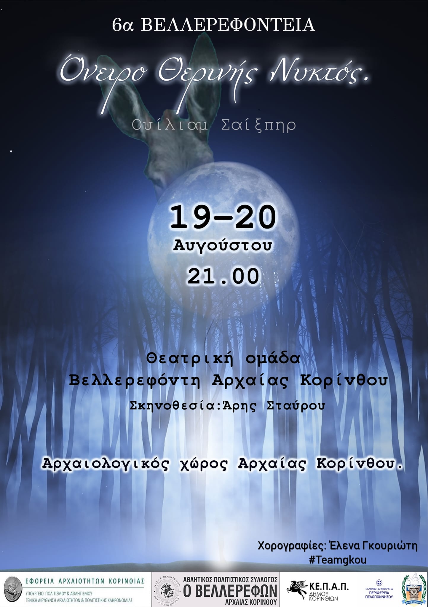 Ο ΑΘΛΗΤΙΚΟΣ ΠΟΛΙΤΙΣΤΙΚΟΣ ΣΥΛΛΟΓΟΣ ” O ΒΕΛΛΕΡΕΦΩΝ” ΑΡΧΑΙΑΣ ΚΟΡΙΝΘΟΥ σε συνεργασία με το Κε.π.α.π Δήμου Κορινθίων , την Περιφέρεια Πελοποννήσου, την Εφορεια Αρχαιοτήτων Κορινθίας και το Δήμος Κορινθίων διοργανώνει δύο ημέρες θεατρικών παραστάσεων στον Αρχαιολογικό χώρο Αρχαίας Κορίνθου την 19 και 20 Αυγούστου 2023 στις 21.00.