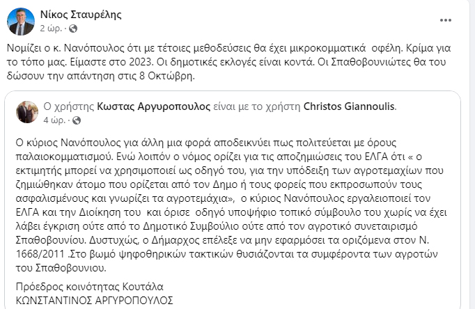 “Νομίζει ο κ. Νανόπουλος ότι με τέτοιες μεθοδεύσεις θα έχει μικροκομματικά οφέλη. Κρίμα για το τόπο μας. Είμαστε στο 2023. Οι δημοτικές εκλογές είναι κοντά. Οι Σπαθοβουνιώτες θα του δώσουν την απάντηση στις 8 Οκτώβρη.”