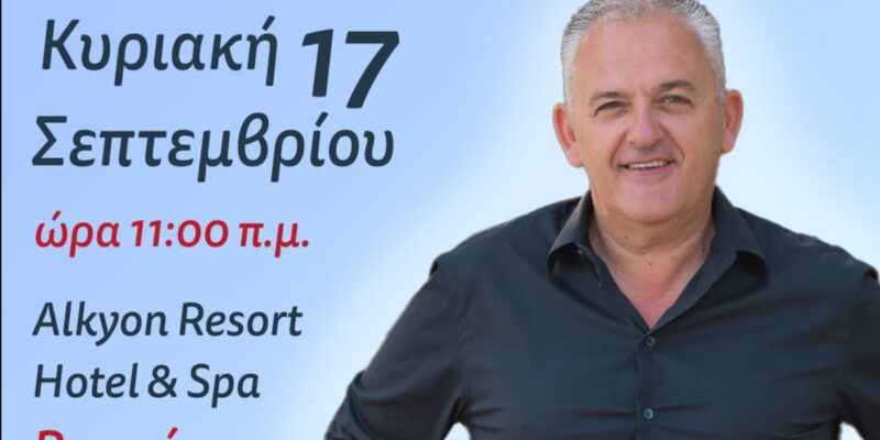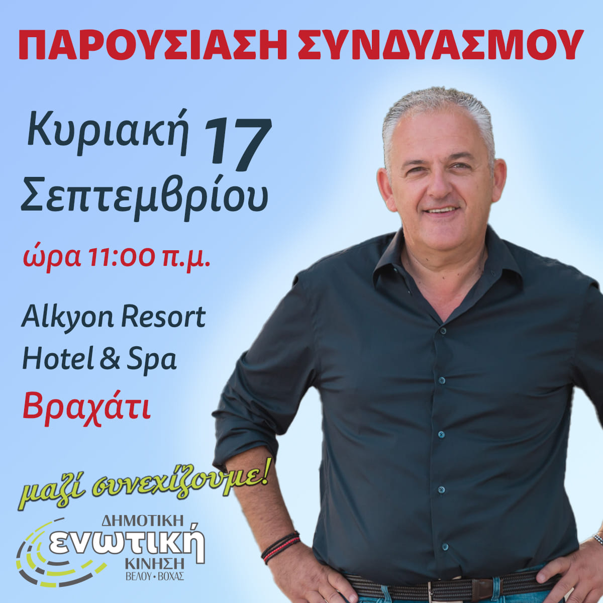 Την Κυριακή 17 Σεπτεμβρίου στις 11:00 το πρωί στο στο Alkyon Resort Hotel & Spa στο Βραχάτι. θα πραγματοποιηθεί η παρουσίαση προσώπων του Συνδυασμού “Δημοτική Ενωτική Κίνηση Δήμου Βέλου – Βόχας” του Αννίβα Παπακυριάκου.