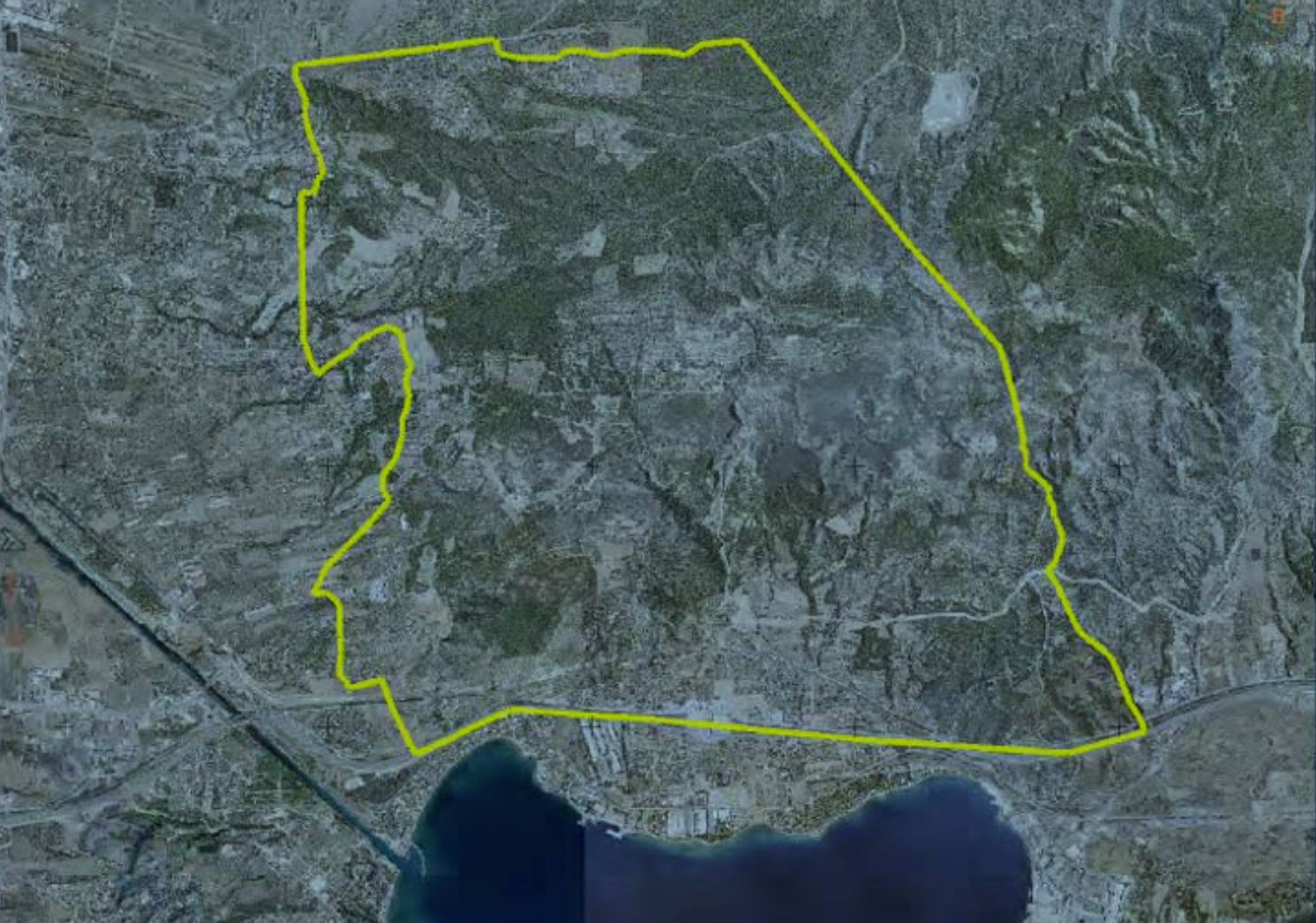 Η εν λόγω έκταση περιγράφεται και οριοθετείται παρακάτω: ξεκινάει από το ρέμα δυτικά της εταιρείας GF ENERGY μέχρι την ζώνη υγραερίου, ακολουθεί τον υπάρχοντα δρόμο και στην συνέχεια δυτικά μέχρι την στροφή του ρέματος νότια του σκουπιδότοπου, από εκεί δυτικά προς τον χωμάτινο δρόμο (οδό Όασης), συνεχίζει στον δρόμο Δημοσίων Υπαλλήλων (Νέα Πολιτεία) μέχρι την διασταύρωση που οδηγεί στο καινούργιο νεκροταφείο του Λουτρακίου, στην συνέχεια νότια προς την οδό Ονείρων, μετά το τέλος της οδού ανατολικά στην οδό μέχρι την οδό Γερανείων, συνεχίζει στην οδό Γερανείων μέχρι την διασταύρωση που οδηγεί στο Άνω Καρμπουνάρι (οδό Καρμπουναρίου) μέχρι την διασταύρωσή της με την οδό Πελοποννήσου ανατολικά του οικισμού Φιλοθέη και φτάνει στο νότιο όριό της την Εθνική οδό…….