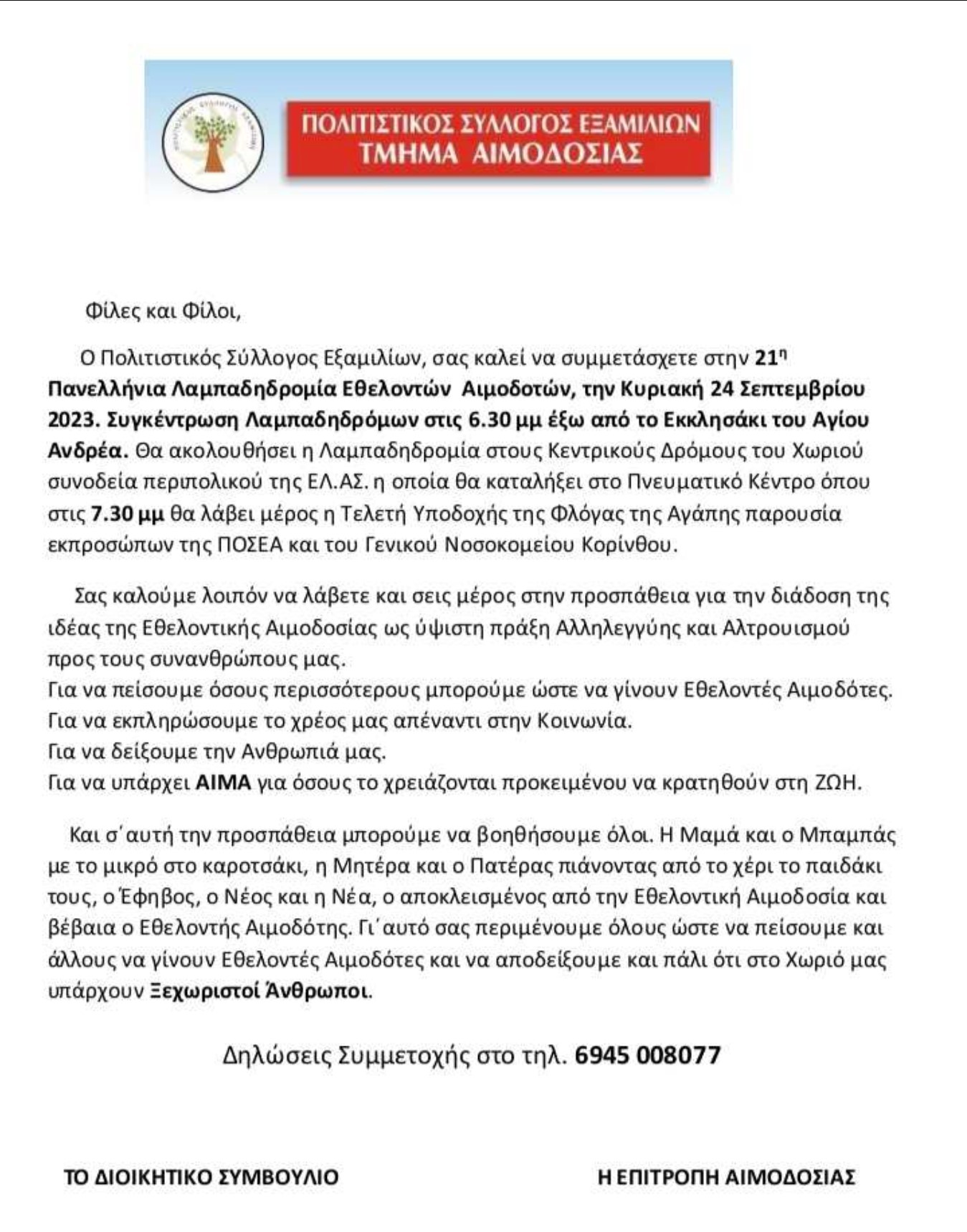 1_ΚΟΡΙΝΘΙΑ4_ΚΟΙΝΩΝΙΑ ΠΟΛΙΤΙΣΤΙΚΟΣ ΣΎΛΛΟΓΟΣ ΕΞΑΜΙΛΙΩΝ- 21η ΠΑΝΕΛΛΗΝΙΑ ΛΑΜΠΑΔΗΔΡΟΜΊΑ ΕΘΕΛΟΝΤΩΝ ΑΙΜΟΔΟΤΩΝ By SFEDONA 18/09/2023 ShareTweet 0