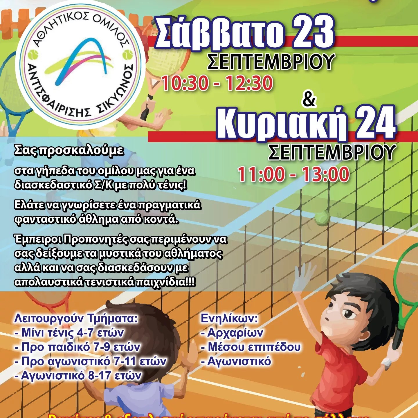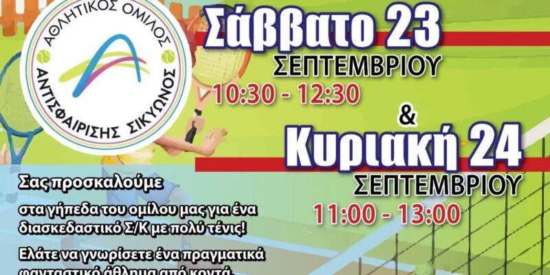 1_ΚΟΡΙΝΘΙΑΑΘΛΗΤΙΣΜΟ Αθλητικός Όμιλος Αντισφαίρισης Σικυώνος: Ελάτε να γνωρίσετε από κοντά τον κόσμο της αντισφαίρισης 23-24/9 By SFEDONA 21/09/2023 ShareTweet 0 Αυτό το Σαββατοκύριακο σας προσκαλούμε στις εγκαταστάσεις του ομίλου μας: να γνωρίσετε από κοντά τον κόσμο της αντισφαίρισης να μάθετε τα μυστικά του αθλήματος από έμπειρους προπονητές να διασκεδάσετε με απολαυστικά τενιστικά παιχνίδια Σάββατο 23/9 10:30-12:30 Κυριακή 24/9 11:00-13:00 Ρακέτες και εξοπλισμός θα παρέχονται από τον όμιλο Σας περιμένουμε!