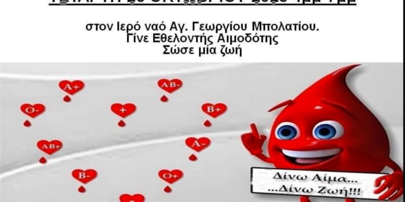 Την Τετάρτη 25 Οκτωβρίου από τις 16:00 το μεσημέρι έως τις 19:00 το απόγευμα θα πραγματοποιηθεί εθελοντική αιμοδοσία στο Μπολάτι και συγκεκριμένα στον Ιερό Ναο του Αγίου Γεωργίου.