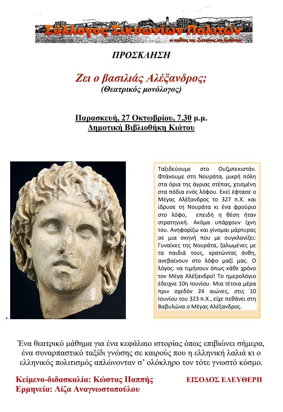 Ο Σύλλογος Σικυωνίων Πολιτών παρουσιάζει το θεατρικό μονόλογος «Ζει ο βασιλιάς Αλέξανδρος;».