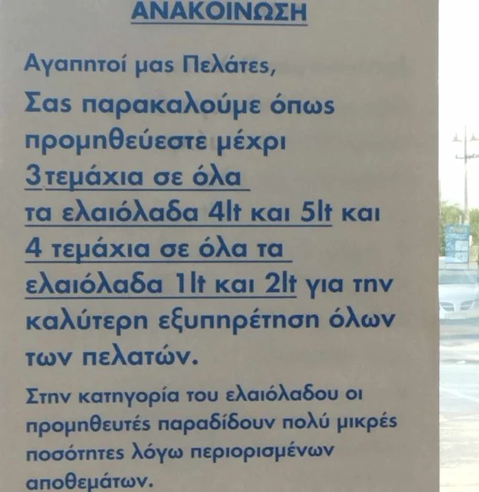 Σύμφωνα με σχετική ενημέρωση, οι καταναλωτές μπορούν να προμηθευτούν μέχρι τρία τεμάχια σε όλα τα ελαιόλαδα 4 και 5 λίτρων και μέχρι τέσσερα τεμάχια σε όλα τα ελαιόλαδα ενός και δύο λίτρων.