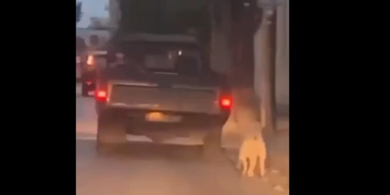 Στο Βιντεο ένας λευκός σκύλος φαίνεται να είναι δεμένος πίσω από αγροτικό, ενώ ο οδηγός του οχήματος οδηγεί, σέρνοντας σχεδόν το άτυχο ζώο.