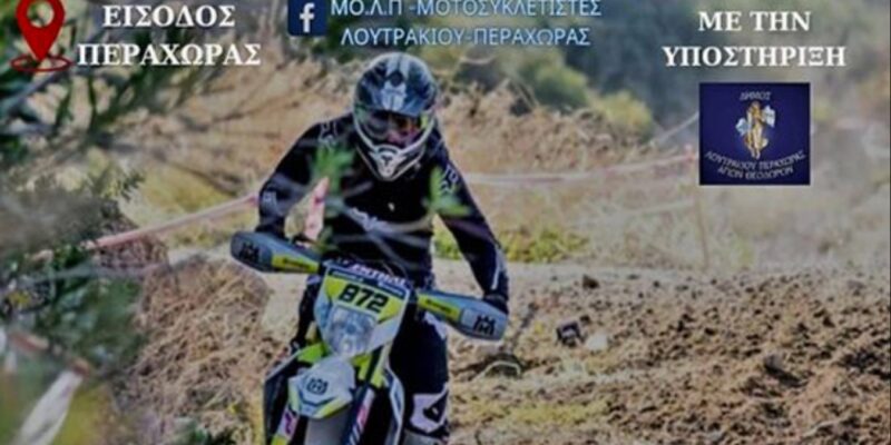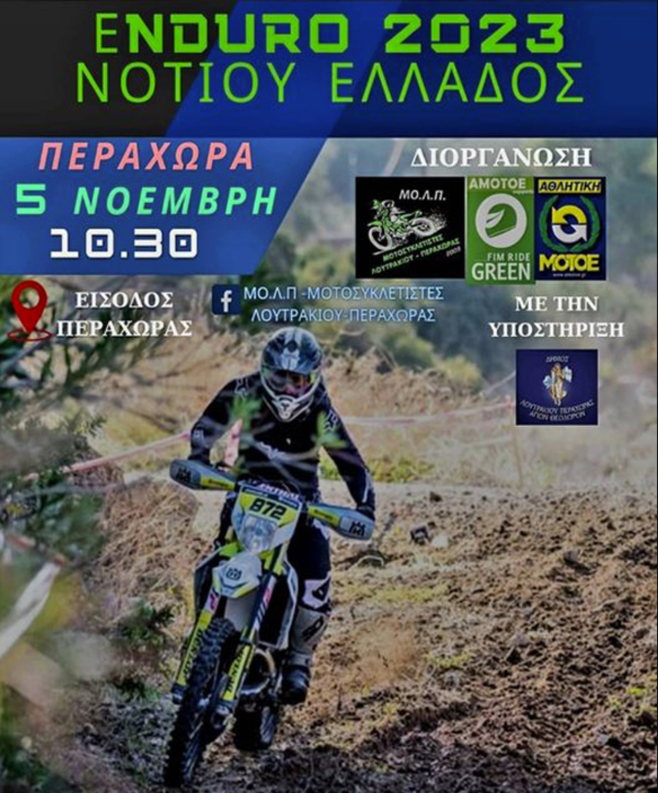 Μία ακόμη σπουδαία και γεμάτη ενδιαφέρον και δράση αθλητική διοργάνωση, το Κύπελλο ENDURO Νοτίου Ελλάδος 2023 “έρχεται” στον Δήμο Λουτρακίου – Περαχώρας – Αγίων Θεοδώρων και συγκεκριμμένα θα ξεκινήσει από την είσοδο της Περαχώρας το Σάββατο 5 Νοεμβρίου. Ώρα εκκίνησης 10:30 π.μ.