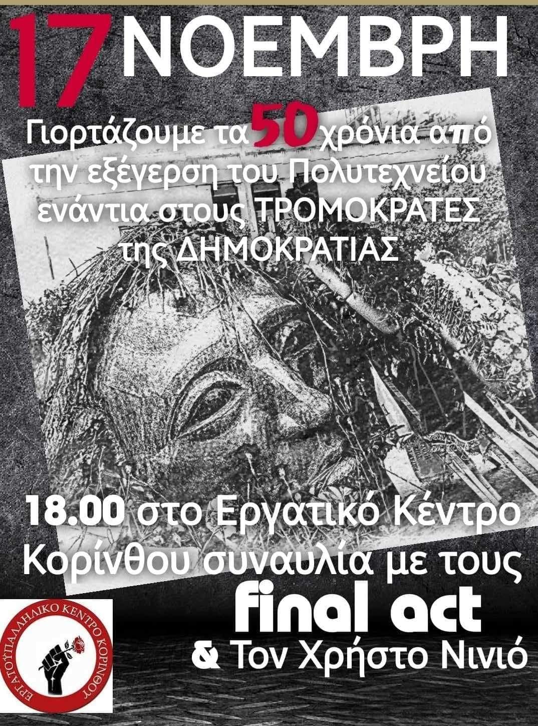 Φέτος συμπληρώνονται 50 χρόνια από την εξέγερση του Πολυτεχνείου. Το Εργατικό Κέντρο Κορίνθου διοργανώνει ανήμερα της Εθνικής Επετείου συναυλία στις 6 μμ με τους Final Act και το Χρήστο Νινιό στην αίθουσα του Εργατικού Κέντρου.