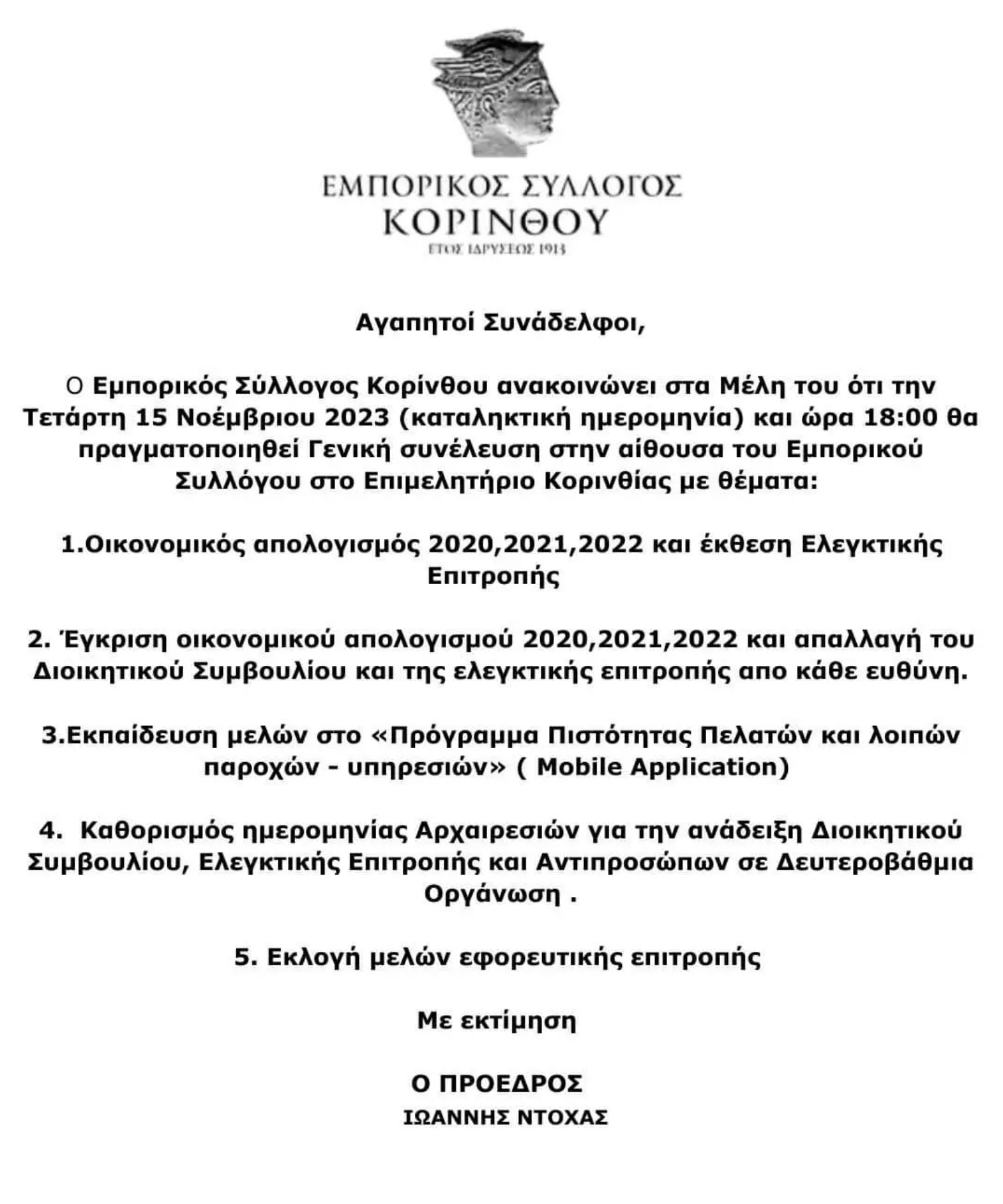 Ο Εμπορικός Σύλλογος Κορίνθου ανακοινώνει στα Μέλη του ότι την Τετάρτη 15 Νοέμβριου 2023 (καταληκτική ημερομηνία) και ώρα 18:00 θα πραγματοποιηθεί Γενική συνέλευση στην αίθουσα του Εμπορικού Συλλόγου στο Επιμελητήριο Κορινθίας με θέματα: