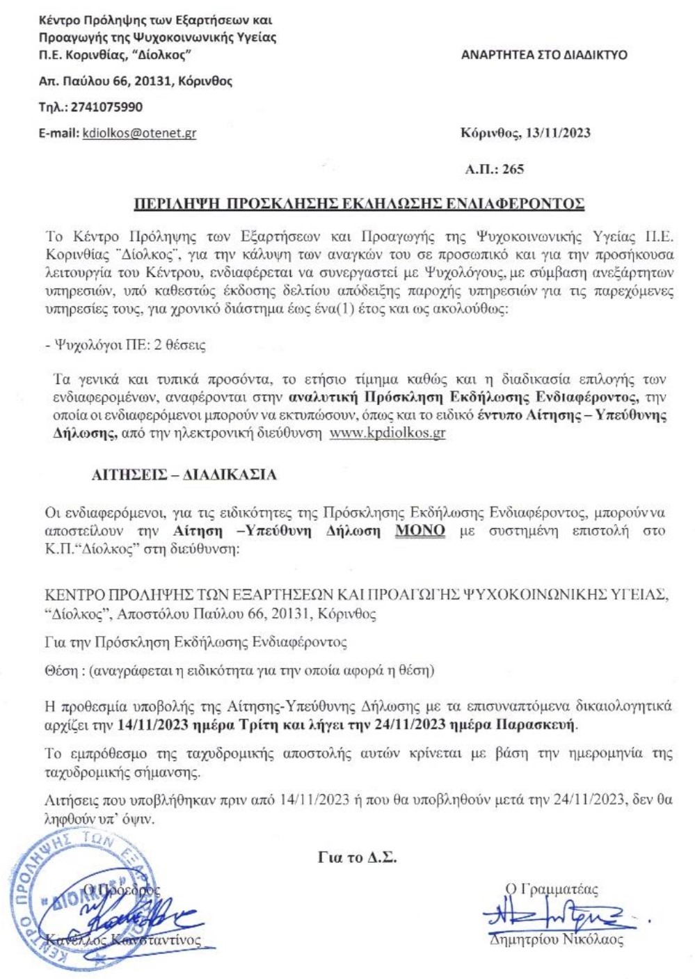 Τo Κέντρo Πρόληψης των Εξαρτήσεων και Προαγωγής της Ψυχοκοινωνικής Υγείας «ΔΙΟΛΚΟΣ» Κορίνθου για την κάλυψης των αναγκών σε προσωπικό, ενδιαφέρεται να συνεργαστεί με Ψυχολόγους με σύμβαση παροχής ανεξάρτητων υπηρεσιών, υπό καθεστώς έκδοσης δελτίου απόδειξης παροχής υπηρεσιών για τις παρεχόμενες υπηρεσίες τους, για χρονικό διάστημα έως ένα (1) έτος και ως ακολούθως: